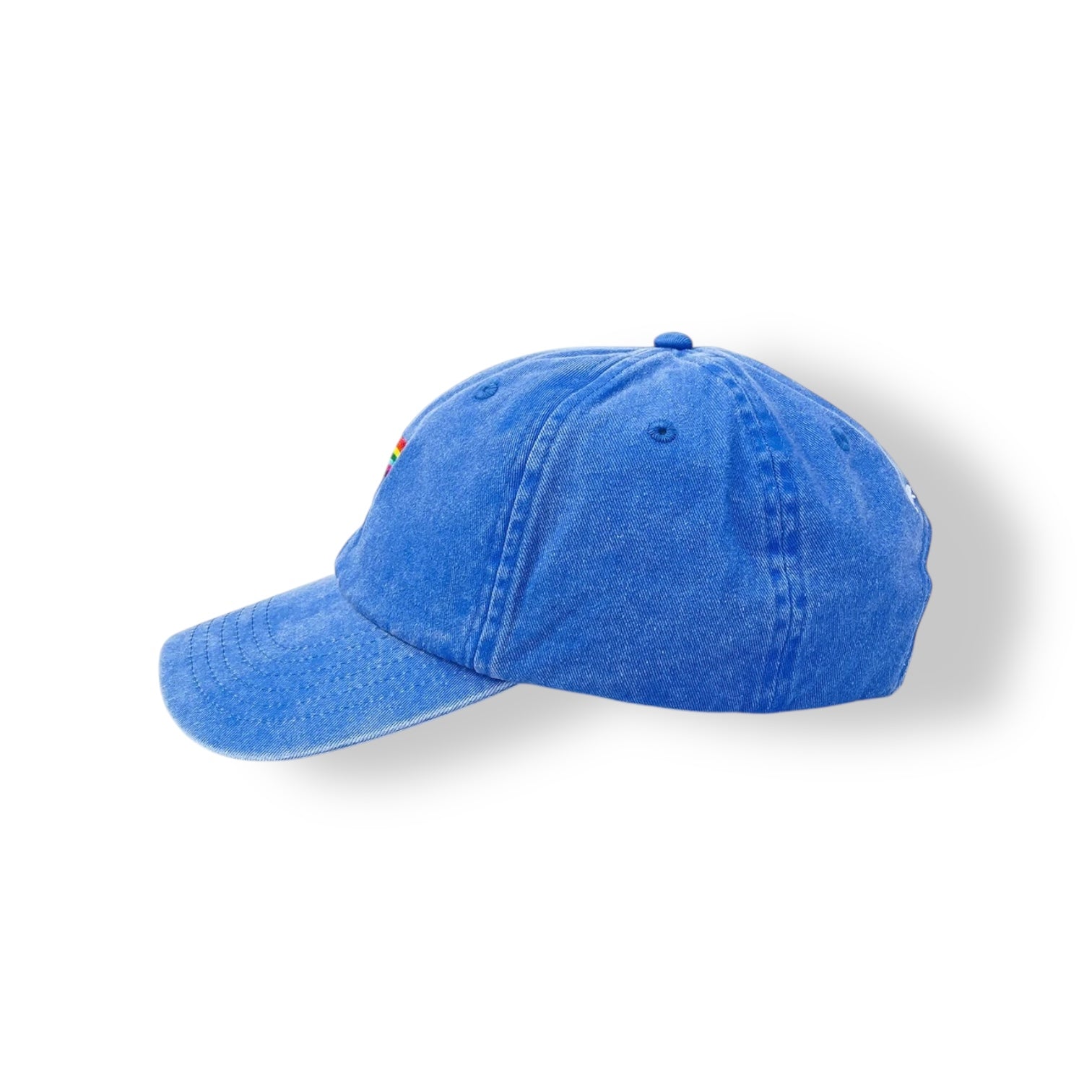 A vintage blue denim cap with Be Nice rainbow artwork embroidery. Adapted and designed from the iconic limited edition screenprint: