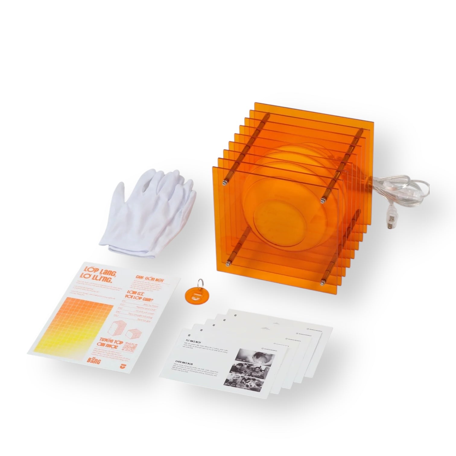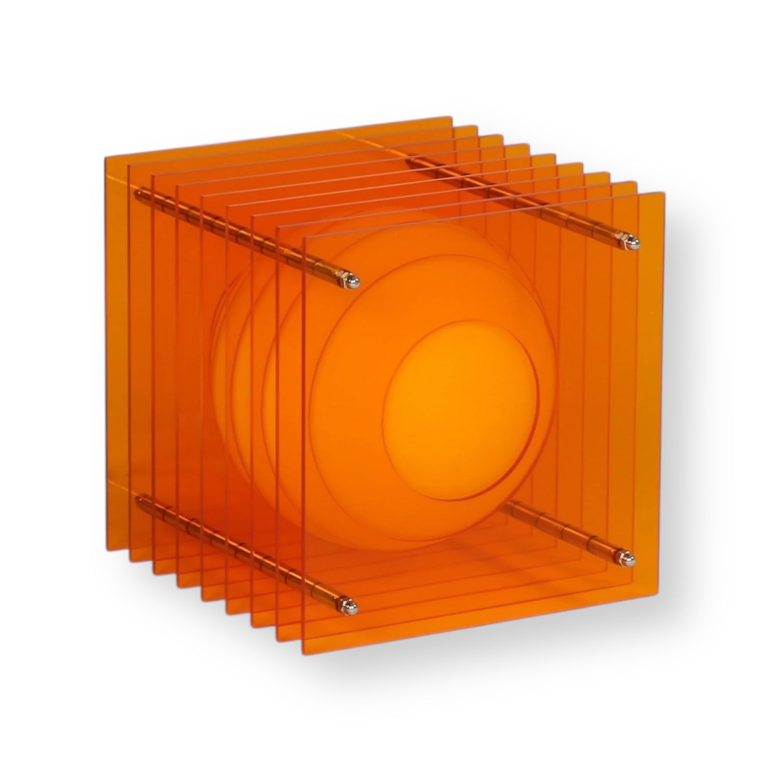 Lop started with the idea of “something floating into something”. Step by step it evolved into “a sphere floating within layers”. Once turned on, the reflections of the sphere on the acrylic layers appear. Reminiscing of a trail after images of a sphere in motion. The sphere is static, but its plural reflections bring movement.