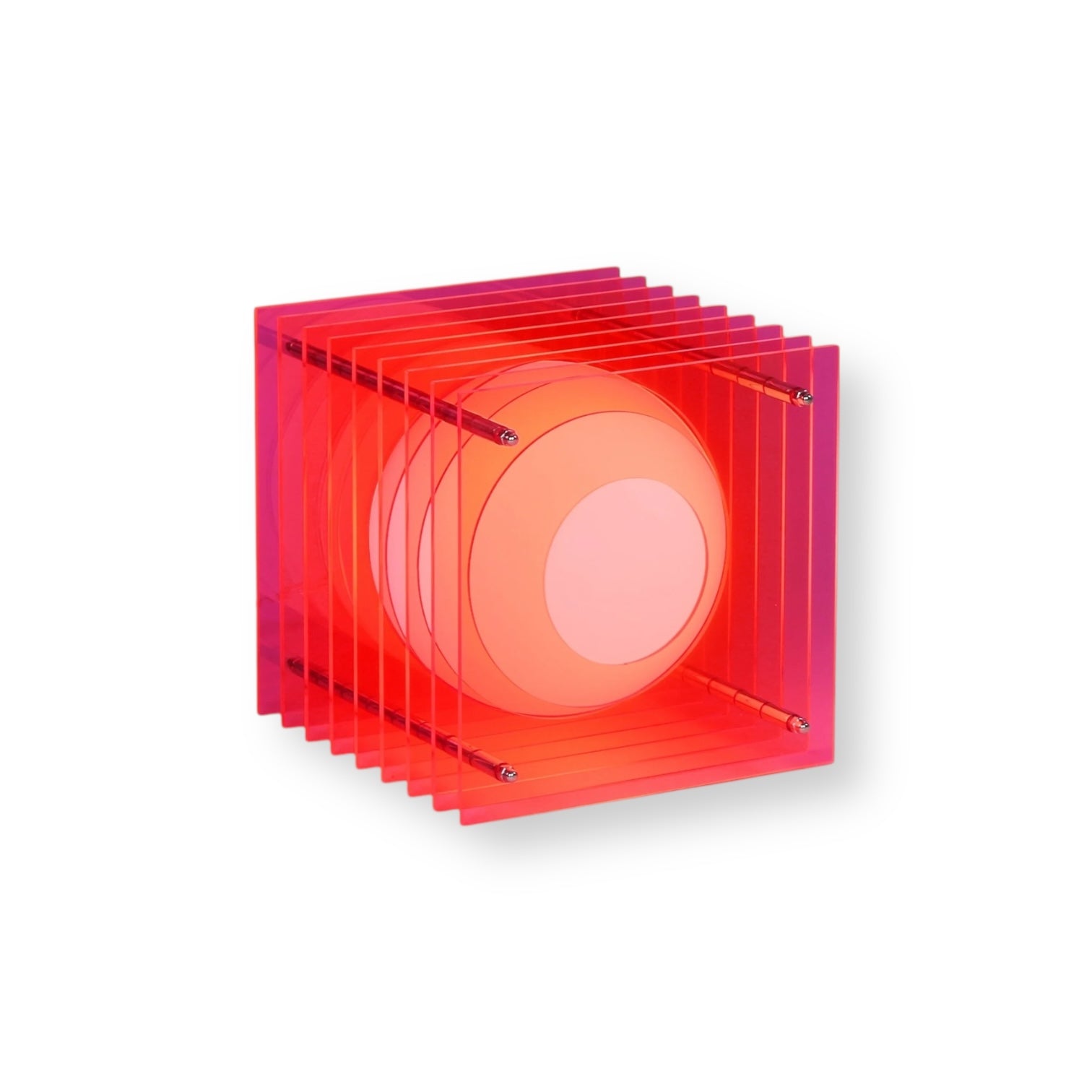 Lop started with the idea of “something floating into something”. Step by step it evolved into “a sphere floating within layers”. Once turned on, the reflections of the sphere on the acrylic layers appear. Reminiscing of a trail after images of a sphere in motion. The sphere is static, but its plural reflections bring movement.