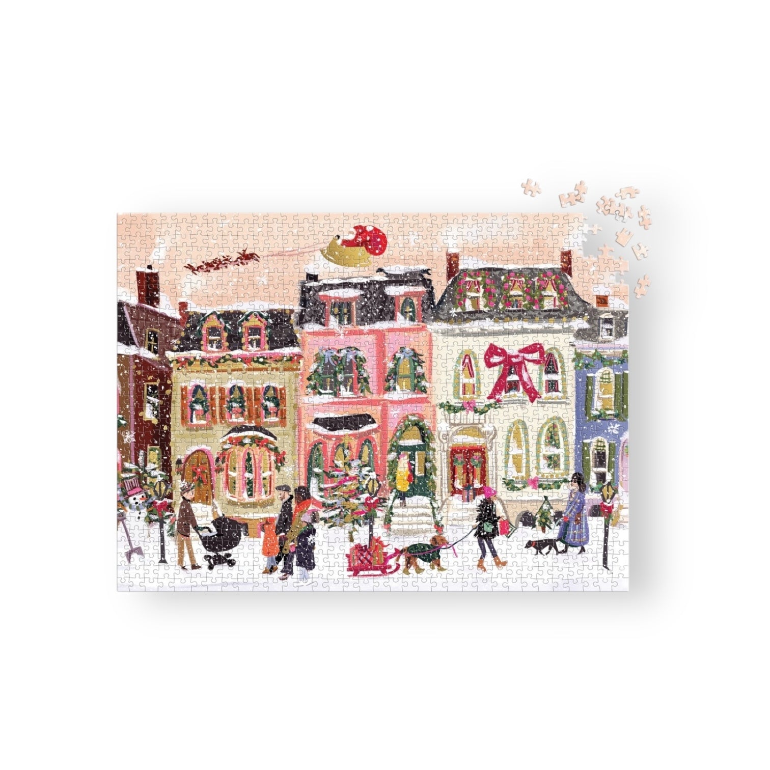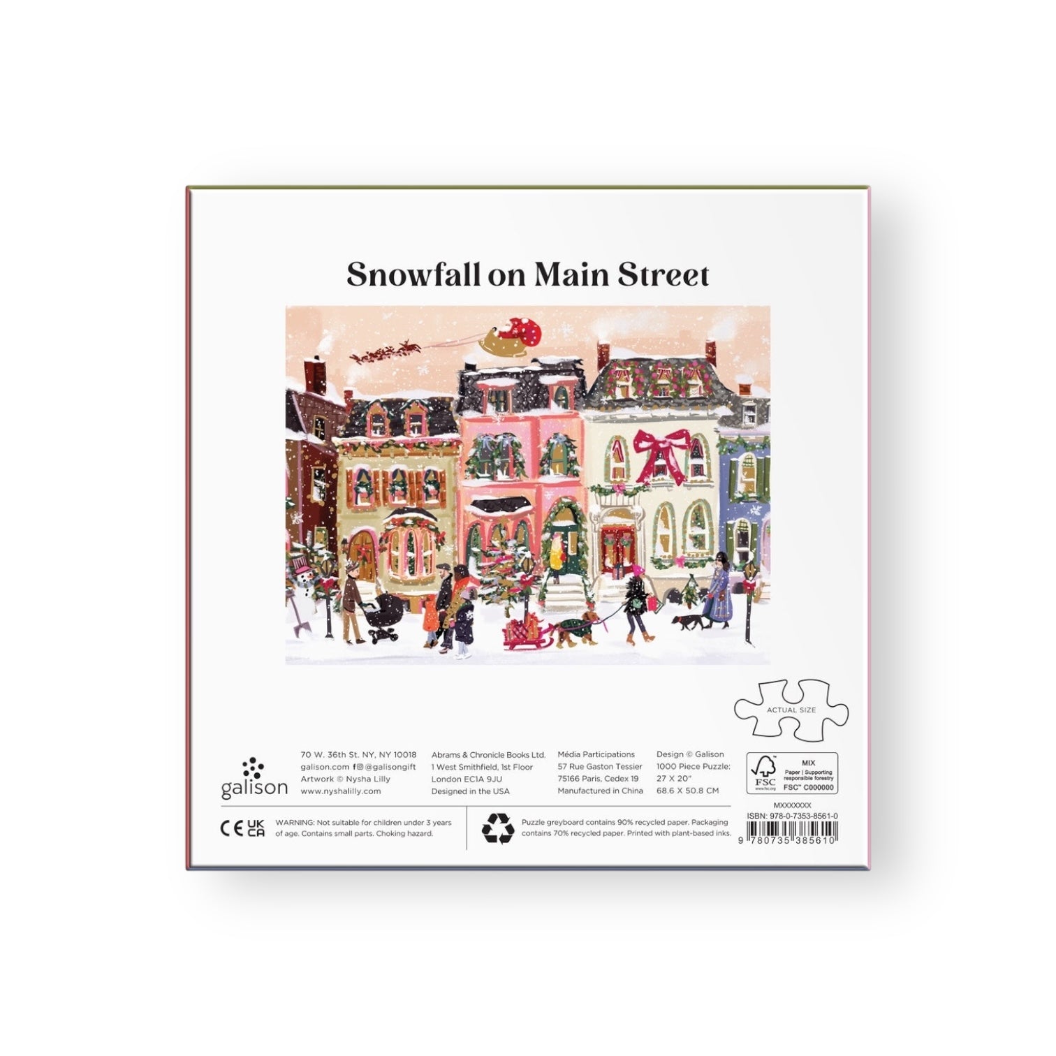 Experience the enchanting winter scene of Nysha Lilly's Snowfall on Main Street 1000 Piece Foil Puzzle. This sophisticated puzzle showcases a charming snow-covered streetscape enhanced with premium foil accents that shimmer like freshly fallen snow. The 1000-piece configuration provides a satisfying challenge for dedicated puzzlers, with precision-cut pieces that fit together seamlessly. The combination of detailed artistry and reflective foil elements creates a dynamic visual experience that transforms as light plays across the completed image.