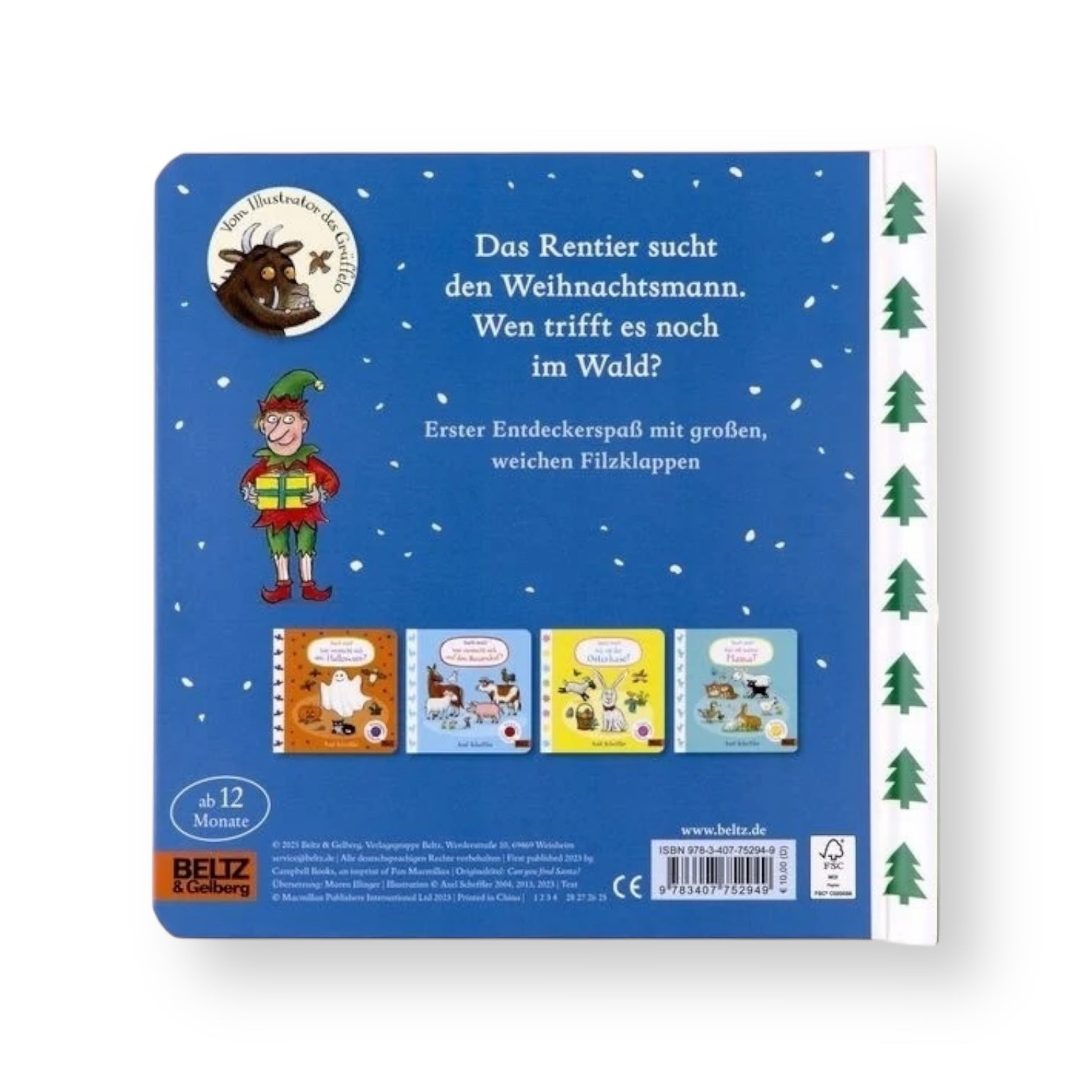 Eine lustige, interaktive Pappe von dem weltberühmten Illustrator des Grüffelo. Mit je 5 Filzklappen, hinter denen sich immer eine Überraschung verbirgt.